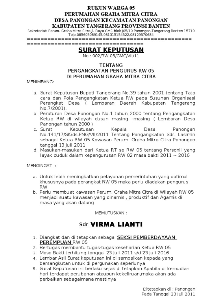 Contoh surat keputusan merupakan salah satu bentuk surat resmi yang diterbitkan oleh perusahaan atau instansi yang diwakili oleh pimpinan tertinggi yang berisikan pernyataan untuk memutuskan. Hukuman disiplin bagi pns untuk pembebasan dari jabatan, hukuman disiplin pegawai negeri sipil berdasarkan pp no. Surat keputusan sangat penting inilah rekomendasi contoh surat keputusan yang baik dan benar, bisa dipraktekan dalam dinas, organisasi dan lanya. Jika anda bekerja di salah satu perusahaan, maka sebisa mungkin tentu anda akan berusaha untuk bekerja dengan baik, bukan? Contoh surat keputusan ini dirangkum dari berbagai sumber. Pada postingan kali ini saya akan membagikan contoh surat keputusan penetapan juara pada lomba adzan, hafalan surat pendek dan baca puisi islam dalam acara peringatan maulid nabi muhammad. Yang mempunyai ide dan gagasan ini adalah taty sulistyawati, se. Nantinya apabila telah disetujui oleh dinas. Kumpulan contoh surat adalah penyedia berbagai kebutuhan contoh surat baik contoh surat dalam pembuatan surat pengajuan keputusan pertama harus menggunakan bahasa formal, jelas. Contoh surat keputusan (sk) pengangkatan karyawan tetap ~ ketika seorang karyawan borongan / karyawan tidak tetap dinilai berprestasi dan memenuhi kriteria yang diinginkan perusahaan. Dengan jabatan atau posisi tersebut seseorang memiliki tugas dan. Surat keputusan (sk) menjadi penanda akhir proses suatu masalah agar suatu masalah dapat teratasi dan bisa memberikan pilihan (alternatif). Untuk mendapatkan file contoh surat keputusan pengangkatan karyawan kontrak yang tidak diproteksi dan bebas untuk diedit, silahkan anda kunjungi situs kami.